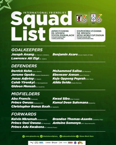 The preparations towards the 2026 FIFA World Cup for Ghana start in November when the Black Stars travel to Asia to face the 2002 World Cup co-host nations, Japan and South Korea.