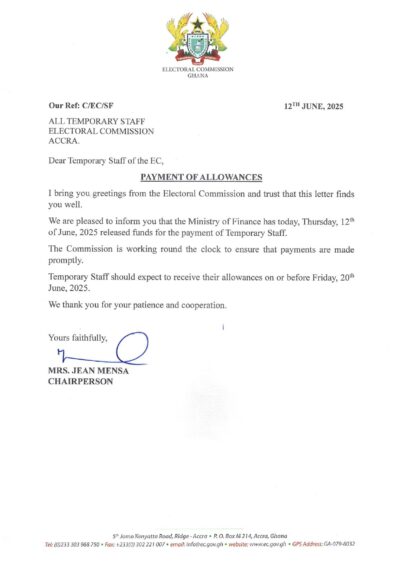 News released by the Electoral Commission of Ghana says the Ministry of Finance has released funds for the payment of outstanding allowances for the officials.