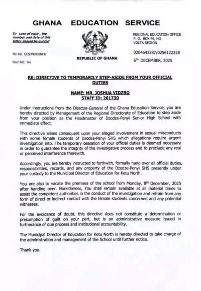 The headmaster has been directed by the Ghana Education Service to hand over all official duties, responsibilities, properties and all records belonging to the institution.