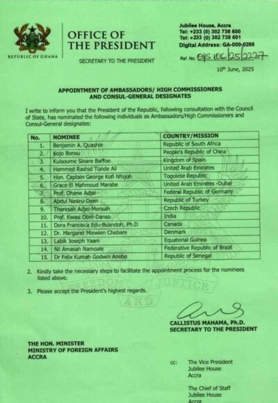 After thorough consultation with the council of the state, the president of Ghana on Saturday announced the appointment of ambassadors to some countri