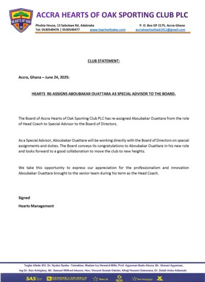 Early Tuesday morning, the club released a statement confirming that it had reassigned Aboubakar Outtara, the club’s former head coach, as a special advisor to the Board.