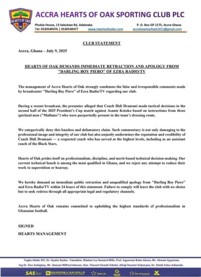 Hearts of Oak demands an apology from Ezra Radio’s Darling Boy Piero for his juju comments