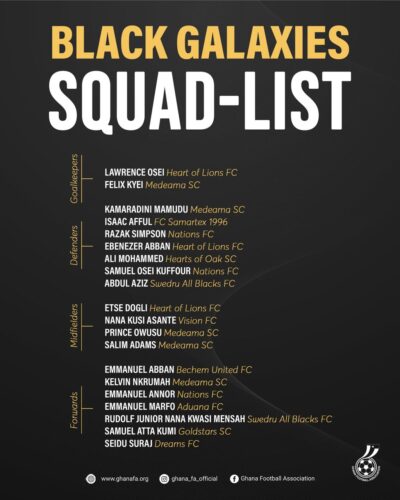 Ghana will not present the main team but rather the B, which is only filled with local players. Black Galaxy head coach, Kasim Mingle, named a 20-man squad on Tuesday afternoon for the friendly against the AFCON-bound South Africa.